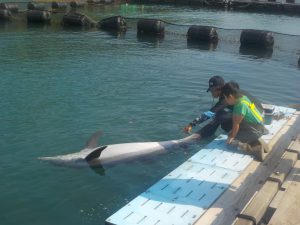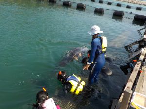 私たちスタッフは朝出勤したらまずイルカ達の様子をチェックしに生簀へ行きます。