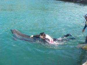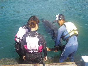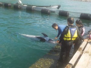 泳ぎ方も足をバタバタしてもらったり、背びれの真ん中をもってもらったりと