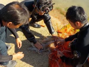 夕方に網で取り囲み、無事生きたまま捕獲に成功しました!