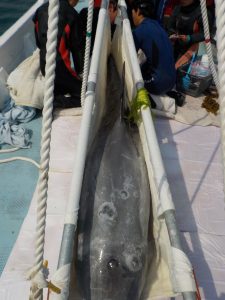 なのでこんな感じで担架に乗せ、船の上に取り上げて採血をしました。