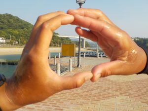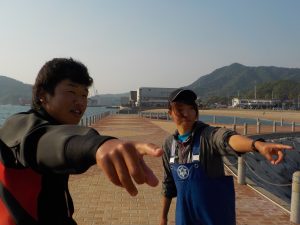 何か看板が立っています!(左手:藤原さん 右手:後原くん 後原くんがどうしてもというのでこのショットを撮りました(笑))