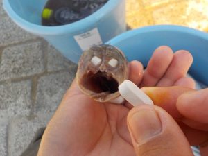薬だけをあげるのではなく、お魚に詰めてあげています!!