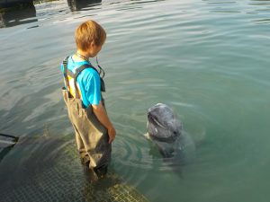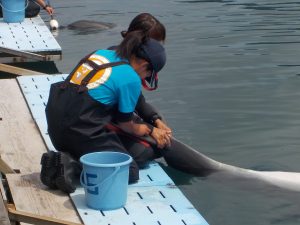 お客さんに楽しんでもらうダンスや回転などのトレーニングも大切ですが、このハズバンダリートレーニングはイルカさんを飼育する上でとっても大切なことです。