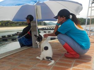 うちの看板犬、こむぎちゃんも天気が良くて気持ち良かったのか桟橋の方までイルカさん達を見にお散歩に来ていました。